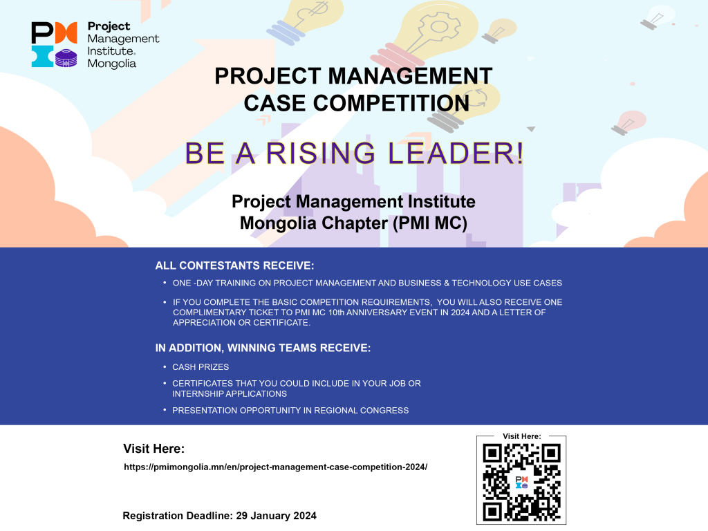 PMI Mongolia Chapter is celebrating its 10th anniversary in 2024, and on this occasion, the PMI Mongolia Chapter Project is going to organize a Management Case Competition among university students.