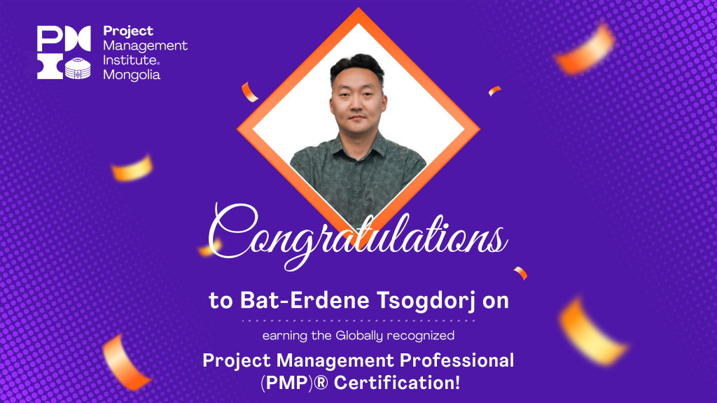 Congratulations to PMI Mongolia Chapter’s member Mr. Bat-Erdene Tsogdorj on earning the globally recognized (Project Management Professional) (PMP) ® Certification issued by the Project Management Institute.