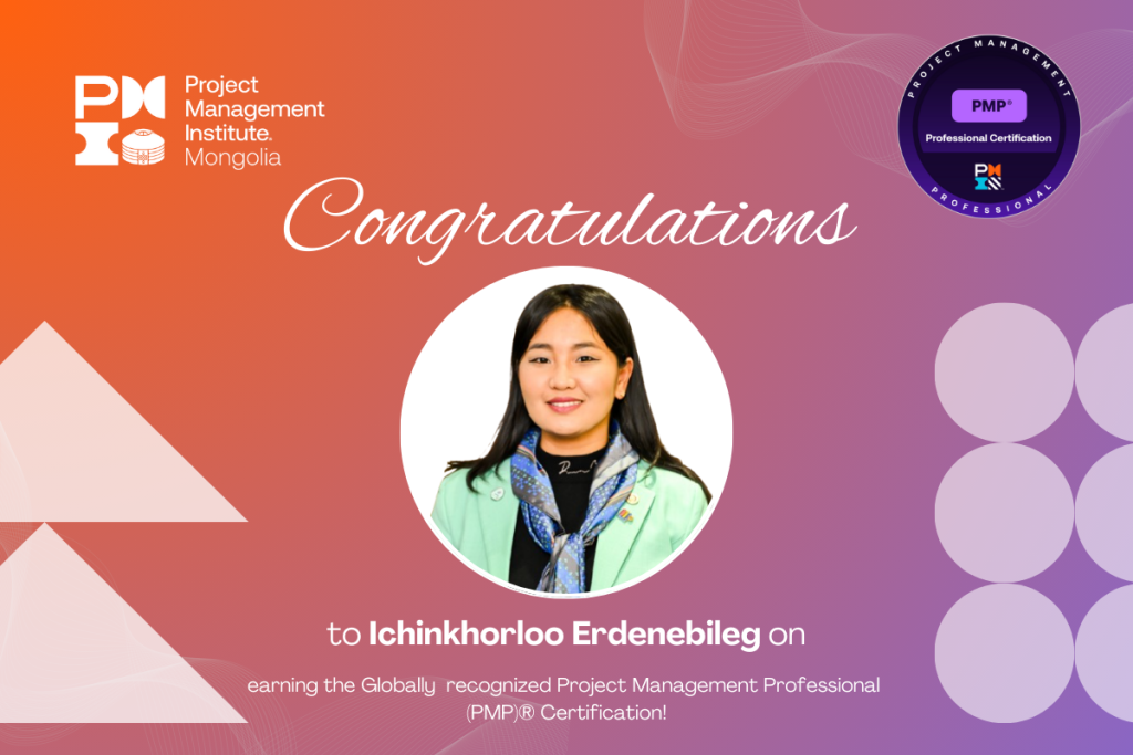 We are proudly highlighting the achievement of Ichinkhorloo Erdenebileg, a valued member of the PMI Mongolia Chapter, who has successfully earned the globally recognized Project Management Professional (PMP)® Certification issued by the Project Management Institute.