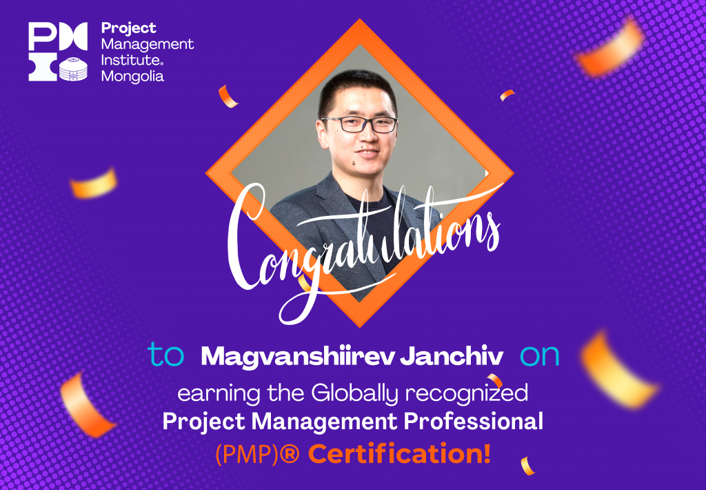 Олон улсын төслийн удирдлагын институт (PMI®)-ээс Мэргэшсэн төслийн удирдагч (Project Management Professional) PMP® зэргийн сертификатаа гардан авсан Пи Эм Ай Монголиа Чаптэрийн гишүүн Жанчив овогтой Магваншийрэвдээ баяр хүргэе!