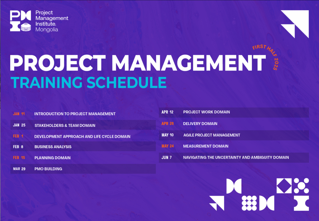 Та бүхэнд 2025 оны эхний хагас жилд Пи Эм Ай Монголиа Чаптэраас зохион байгуулах Төслийн удирдлагын цахим сургалтын хуваарийг зарлаж байгаадаа таатай байна. Сургалт тус бүрийн дэлгэрэнгүй зарын удахгүй нийтлэх болно.