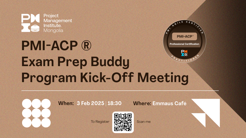 Хэрэв та PMI-ACP ® зэргийн шалгалт өгөхөөр төлөвлөж байгаа бол бол таныг Пи Эм Ай Монголиа Чаптэрийн дэргэдэх PMI-ACP ® Exam Prep Buddy Program-д урьж байна.