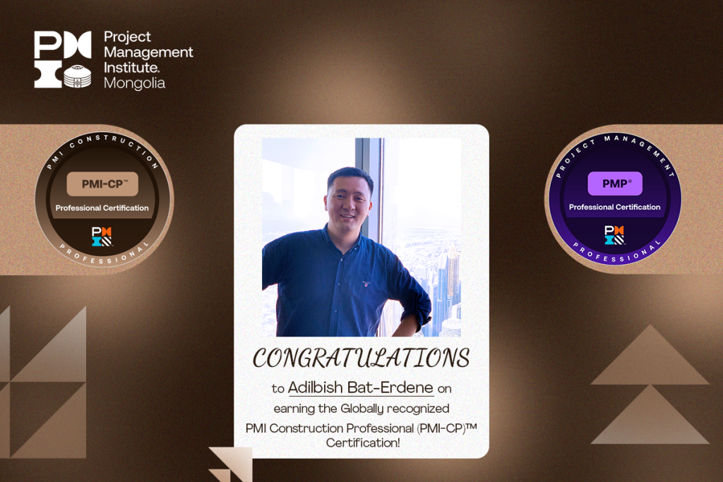 Пи Эм Ай Монголиа Чаптэрийн эрхэм гишүүн Бат-Эрдэнийн Адилбиш Олон улсын төслийн удирдлагын институт (PMI®)-ээс Мэргэшсэн Барилгын мэргэжилтэн (PMI Construction Professional) PMI-CP™ зэргийн сертификатаа гардан авсаныг та бүхэндээ дуулгахад таатай байна.