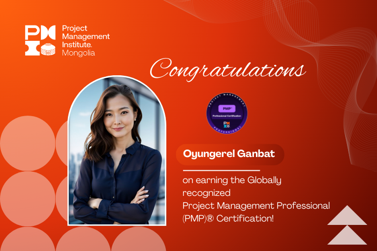 Пи Эм Ай Монголиа Чаптэрийн эрхэм гишүүн Ганбатын Оюунгэрэл нь Project Management Institute (PMI®) байгууллагаас олгодог Мэргэшсэн төслийн удирдагч (Project Management Professional (PMP®)) сертификатыг амжилттай гардан авсан баярт мэдээг та бүхэнд дуулгахад таатай байна.